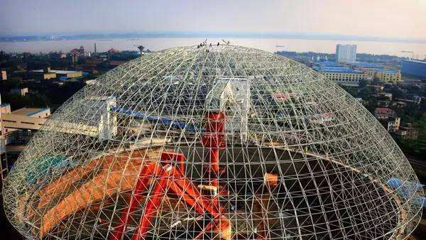 圓形堆取料機被半球形的煤罐外殼所籠罩,堆取料作業時集中于定心旋轉的回轉范圍內,不受臺風等惡劣天氣的影響,同時產生的揚塵范圍小,又被拘囿在固定的區域內,所以,它很好地解決了常規的敞開式條形煤場堆取料機作業時所產生的大量揚塵對周邊環境造成的大范圍污染,既美觀又環保,綜合效益高,具備儲煤量大、占地面積小、場地利用率高、安全可靠性高、環保效益好等優點。